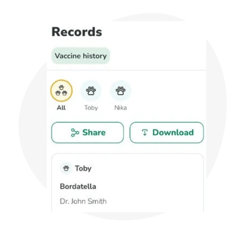 Download and share your pet’s vaccine history, and find out when their next one is due.